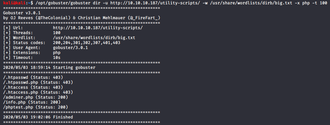 gobuster dir -u http://10.10.10.187/utility-scripts/ -w /usr/share/wordlists/dirb/big.txt -x php -t 100