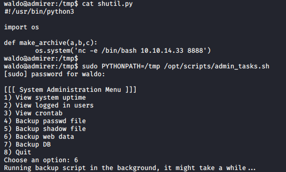 sudo PYTHONPATH=/tmp /opt/scripts/admin_tasks.sh
