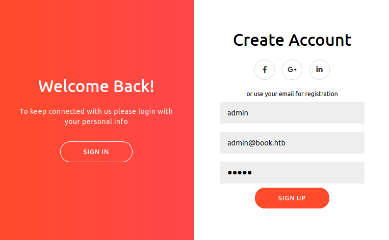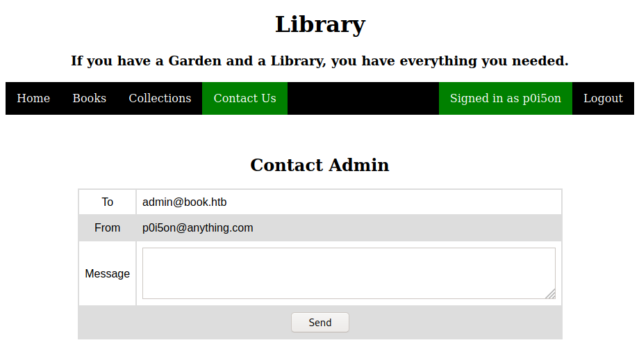 From the Contact Us page I got the admin email ID –> admin@book.htb