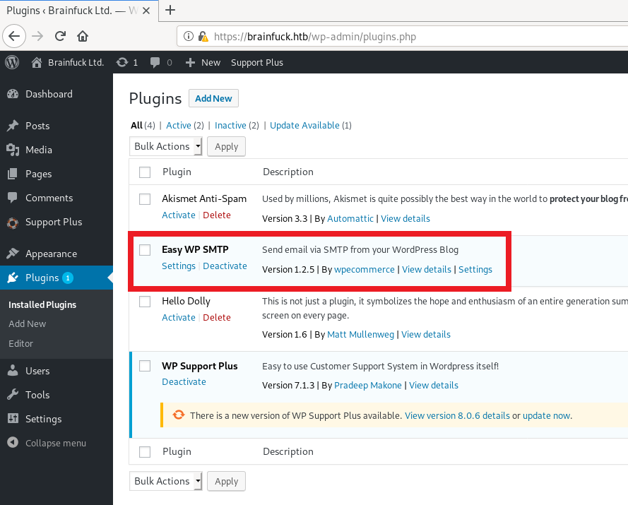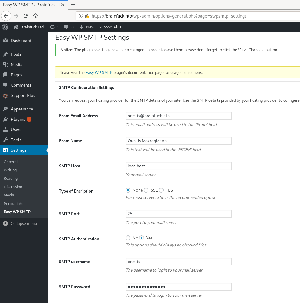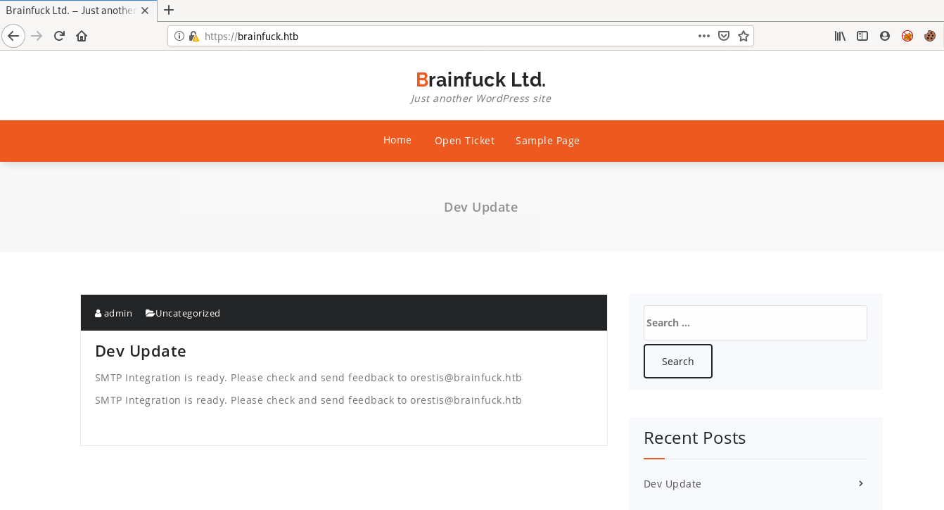 From the Nmap output, we know that its a WordPress 4.7.3 website and the commonName is brainfuck.htb and the alternative names are www.brainfuck.htb and sup3rs3cr3t.brainfuck.htb