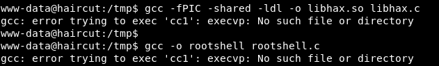 gcc -fPIC -shared -ldl -o /tmp/libhax.so /tmp/libhax.c