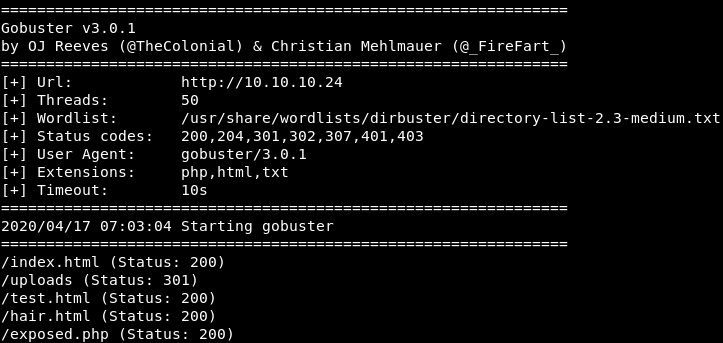 gobuster dir -u 10.10.10.24 -w /usr/share/wordlists/dirbuster/directory-list-2.3-medium.txt -x php,html,txt -t 50