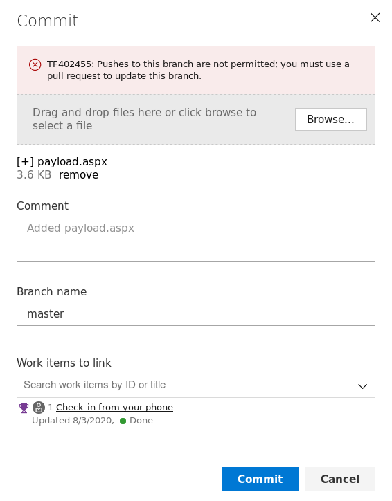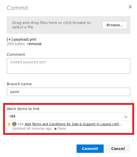 browse and select the YAML file and use one of the work item IDs to select a work item and click on Commit