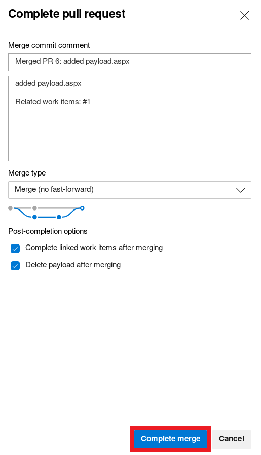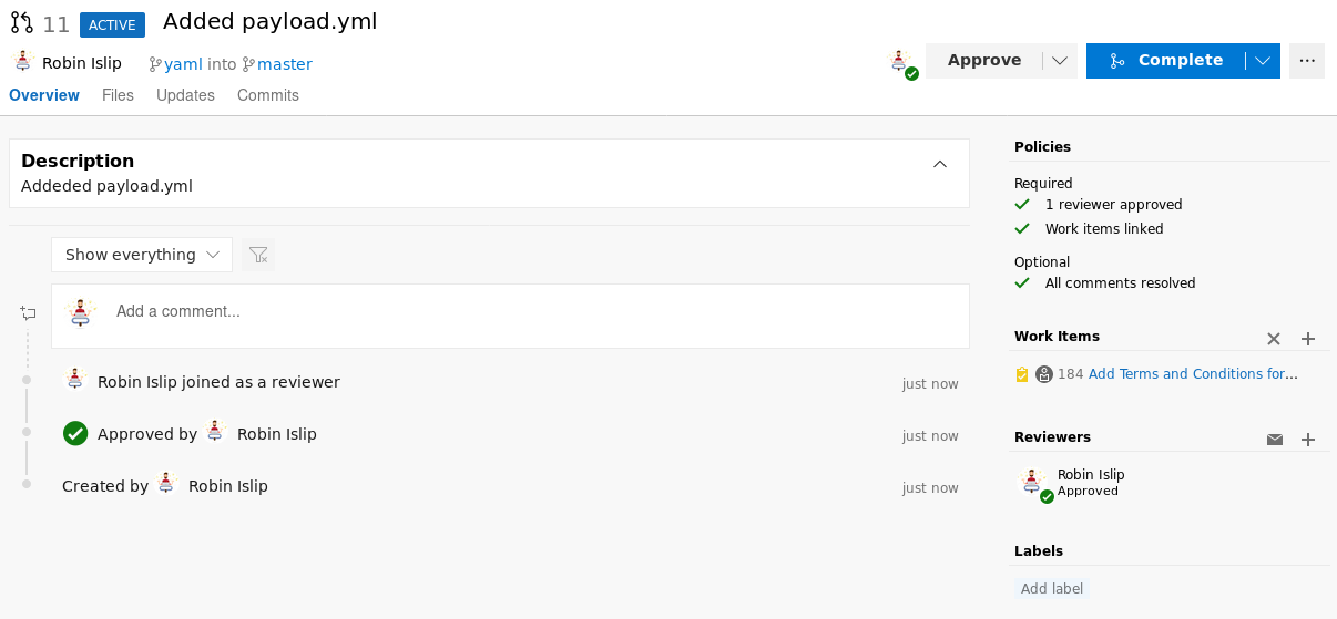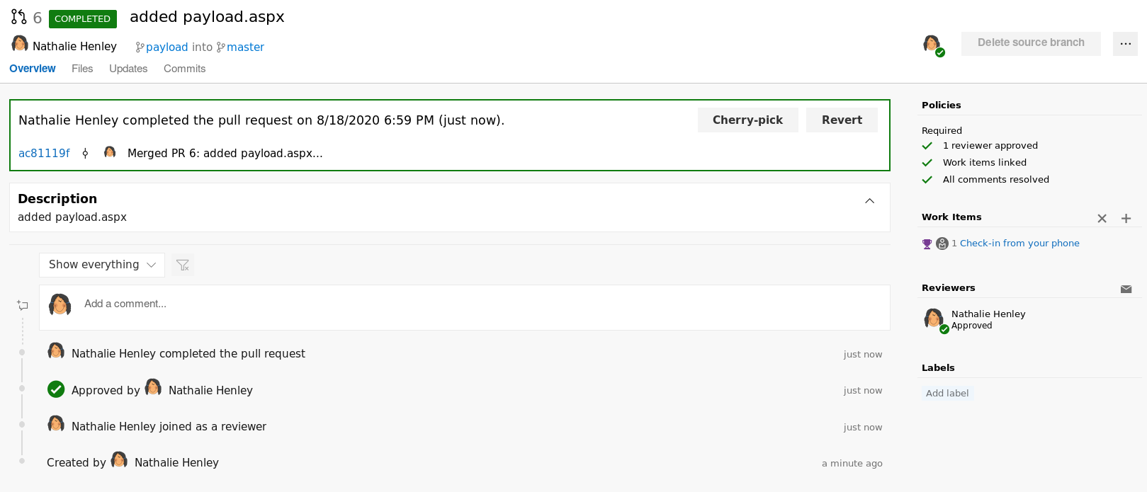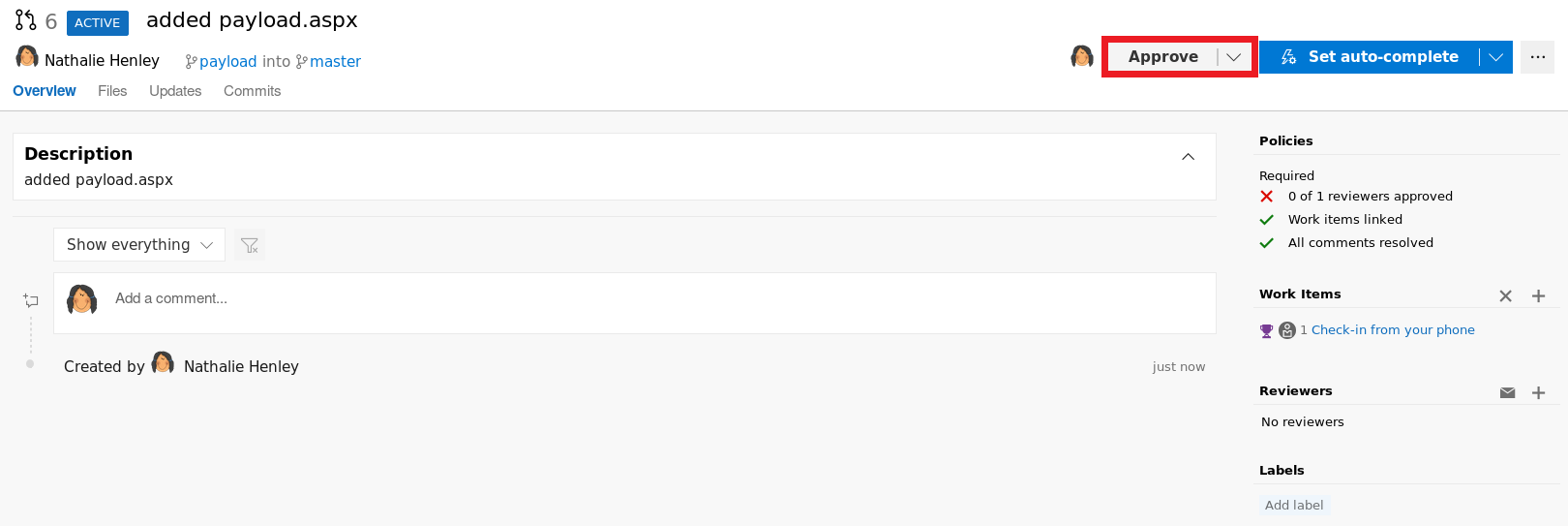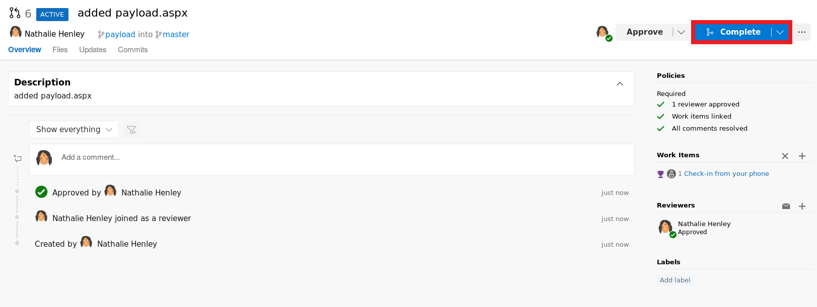 Now just like before, click on Create a pull request and then Approve and Complete the merge